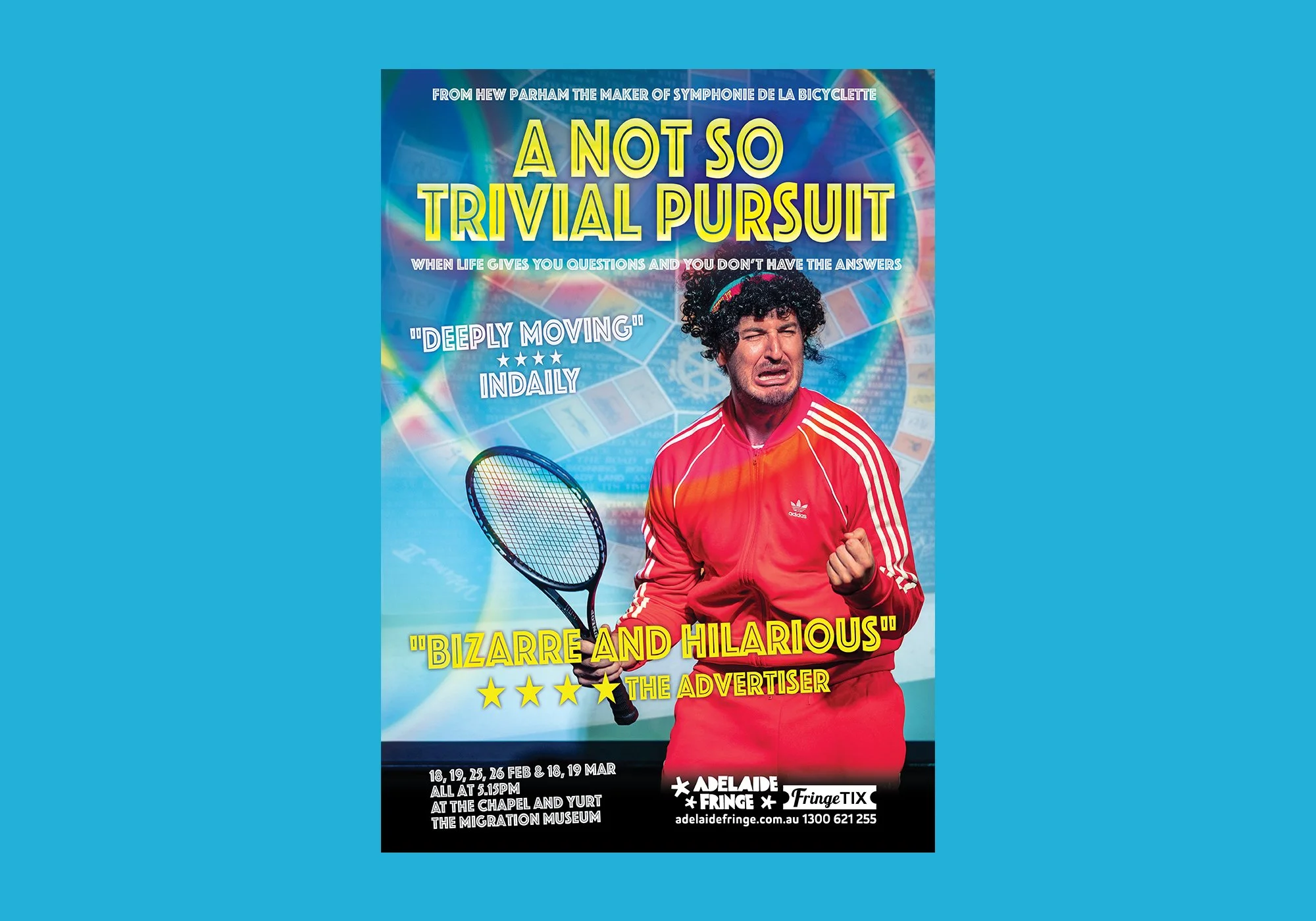 A not so trivial pursuitHew Parham, a well known Adelaide actor and comedian, whose new show for the Adelaide Fringe ‘A not so trivial pursuit’ required a bright and eye-catching promotional poster.